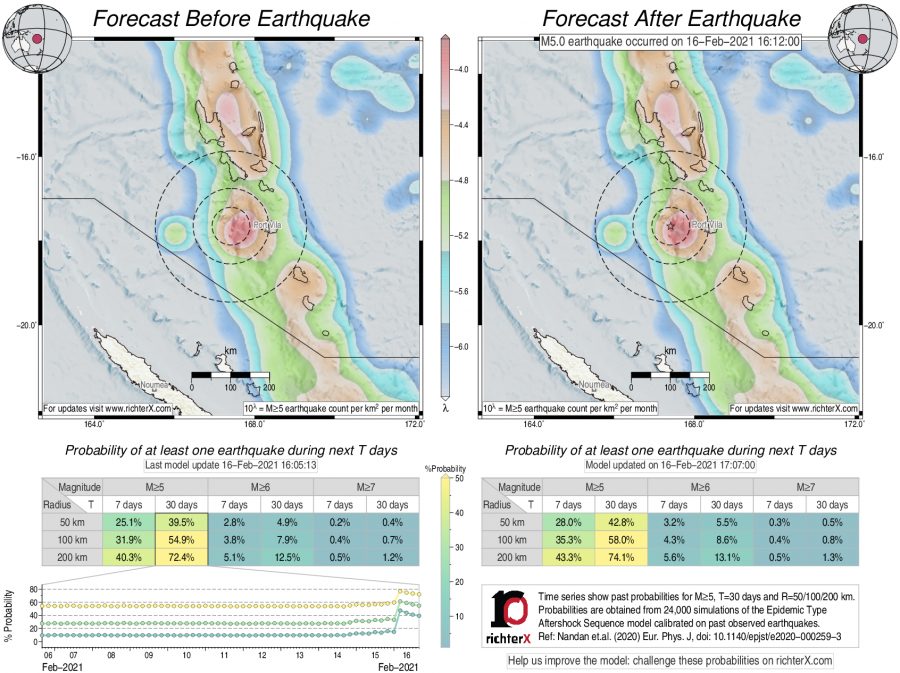 Description: Above is our model's last forecast before the earthquake (left side) and the first forecast after the earthquake (right side). The probabilities are obtained by counting the fraction of simulations that had at least one earthquake above different magnitudes (M5, M6 or M7) within different areas (50, 100 or 200 km) in the next 7 or 30 days. The last 10 day time history of the probabilities (for M5+ during the next 30 days) is shown on the lower left side.