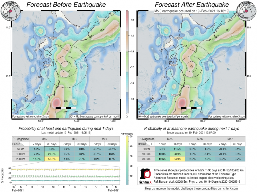 Description: Above is our model's last forecast before the earthquake (left side) and the first forecast after the earthquake (right side). The probabilities are obtained by counting the fraction of simulations that had at least one earthquake above different magnitudes (M5, M6 or M7) within different areas (50, 100 or 200 km) in the next 7 or 30 days. The last 10 day time history of the probabilities (for M5+ during the next 30 days) is shown on the lower left side.