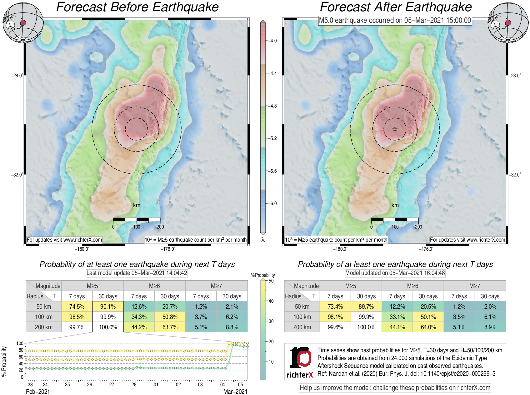 Earthquake Forecast following M5 in Kermadec Islands, New Zealand