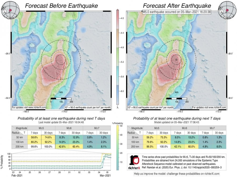 Earthquake Forecast following M5 offshore Kermadec Islands