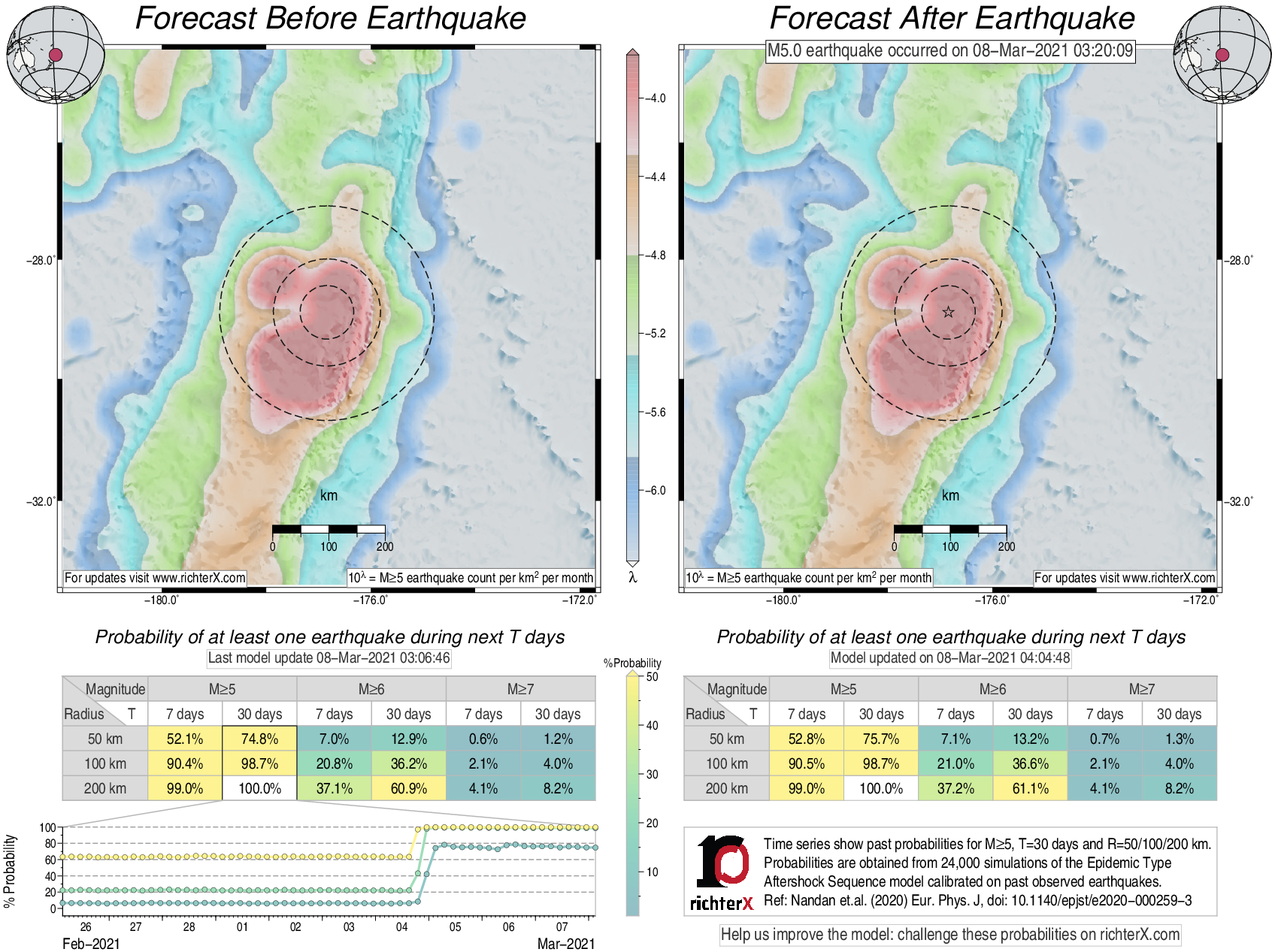 Description: Above is our model's last forecast before the earthquake (left side) and the first forecast after the earthquake (right side). The probabilities are obtained by counting the fraction of simulations that had at least one earthquake above different magnitudes (M5, M6 or M7) within different areas (50, 100 or 200 km) in the next 7 or 30 days. The last 10 day time history of the probabilities (for M5+ during the next 30 days) is shown on the lower left side.