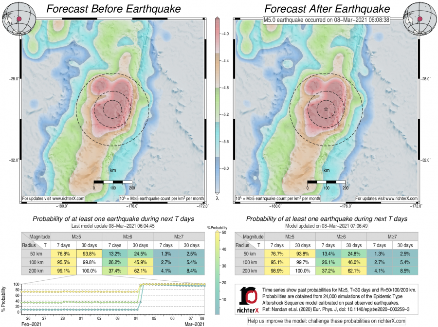 Description: Above is our model's last forecast before the earthquake (left side) and the first forecast after the earthquake (right side). The probabilities are obtained by counting the fraction of simulations that had at least one earthquake above different magnitudes (M5, M6 or M7) within different areas (50, 100 or 200 km) in the next 7 or 30 days. The last 10 day time history of the probabilities (for M5+ during the next 30 days) is shown on the lower left side.
