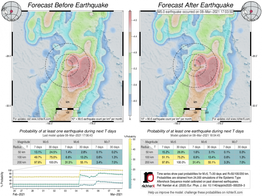 Earthquake Forecast following M5 offshore Kermadec Islands