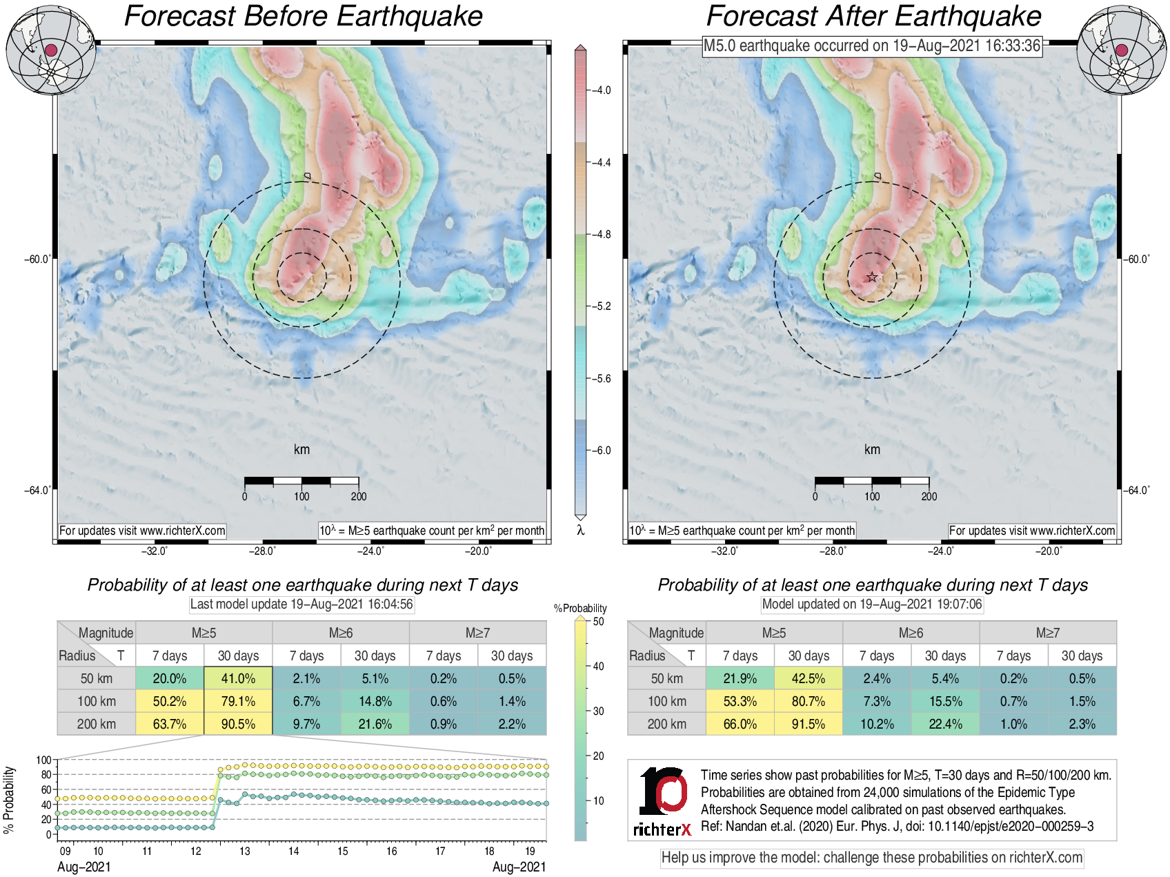 Description: Above is our model's last forecast before the earthquake (left side) and the first forecast after the earthquake (right side). The probabilities are obtained by counting the fraction of simulations that had at least one earthquake above different magnitudes (M5, M6 or M7) within different areas (50, 100 or 200 km) in the next 7 or 30 days. The last 10 day time history of the probabilities (for M5+ during the next 30 days) is shown on the lower left side.