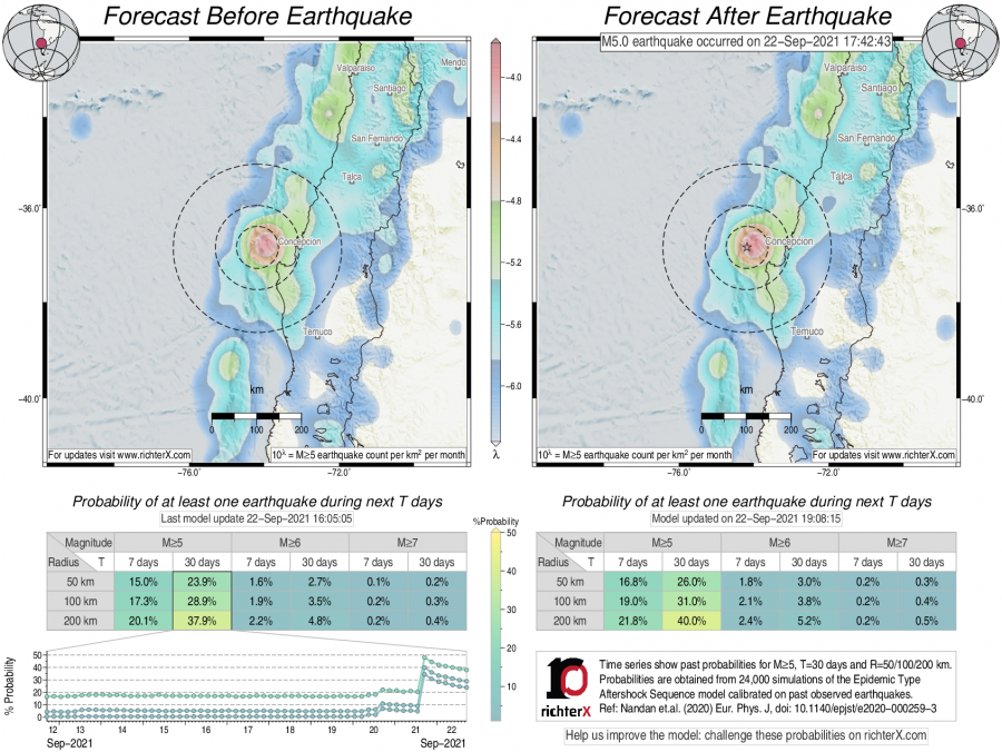 Description: Above is our model's last forecast before the earthquake (left side) and the first forecast after the earthquake (right side). The probabilities are obtained by counting the fraction of simulations that had at least one earthquake above different magnitudes (M5, M6 or M7) within different areas (50, 100 or 200 km) in the next 7 or 30 days. The last 10 day time history of the probabilities (for M5+ during the next 30 days) is shown on the lower left side.