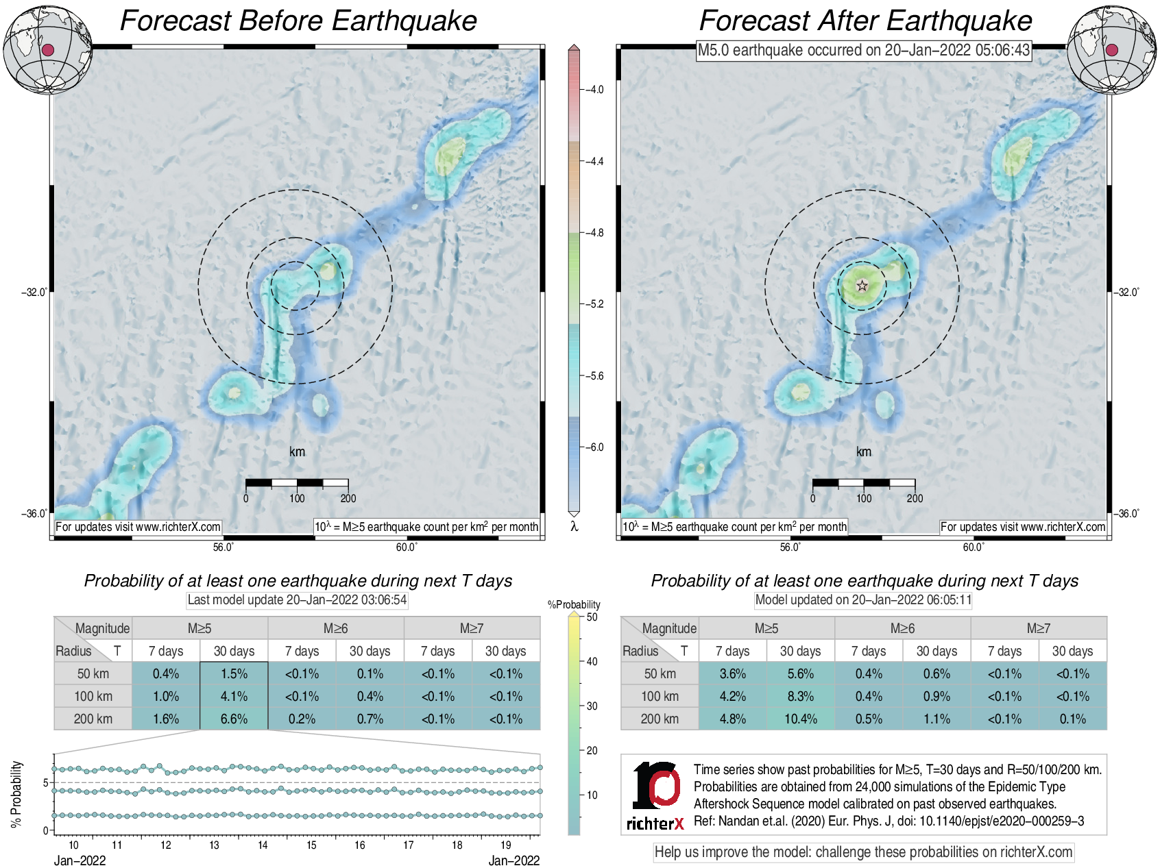 Description: Above is our model's last forecast before the earthquake (left side) and the first forecast after the earthquake (right side). The probabilities are obtained by counting the fraction of simulations that had at least one earthquake above different magnitudes (M5, M6 or M7) within different areas (50, 100 or 200 km) in the next 7 or 30 days. The last 10 day time history of the probabilities (for M5+ during the next 30 days) is shown on the lower left side.