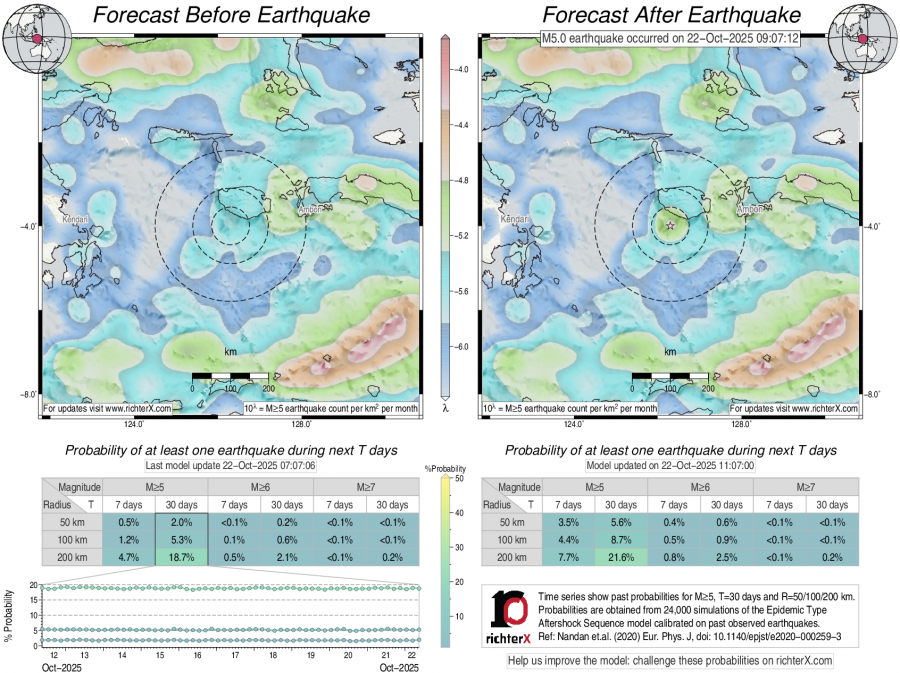 Description: Above is our model's last forecast before the earthquake (left side) and the first forecast after the earthquake (right side). The probabilities are obtained by counting the fraction of simulations that had at least one earthquake above different magnitudes (M5, M6 or M7) within different areas (50, 100 or 200 km) in the next 7 or 30 days. The last 10 day time history of the probabilities (for M5+ during the next 30 days) is shown on the lower left side.