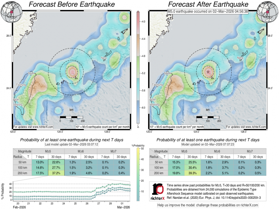 Description: Above is our model's last forecast before the earthquake (left side) and the first forecast after the earthquake (right side). The probabilities are obtained by counting the fraction of simulations that had at least one earthquake above different magnitudes (M5, M6 or M7) within different areas (50, 100 or 200 km) in the next 7 or 30 days. The last 10 day time history of the probabilities (for M5+ during the next 30 days) is shown on the lower left side.