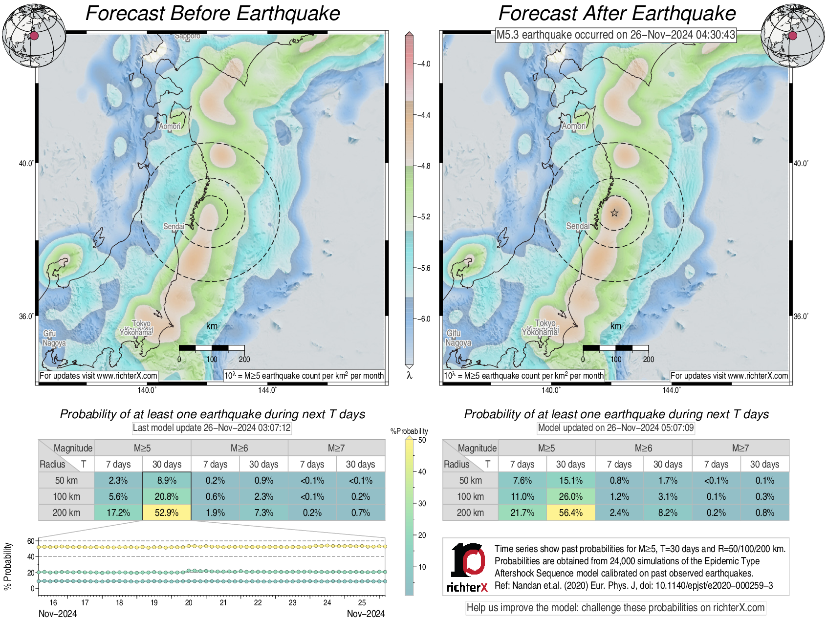 Earthquake Forecast following M5.3 offshore east Honshu, Japan