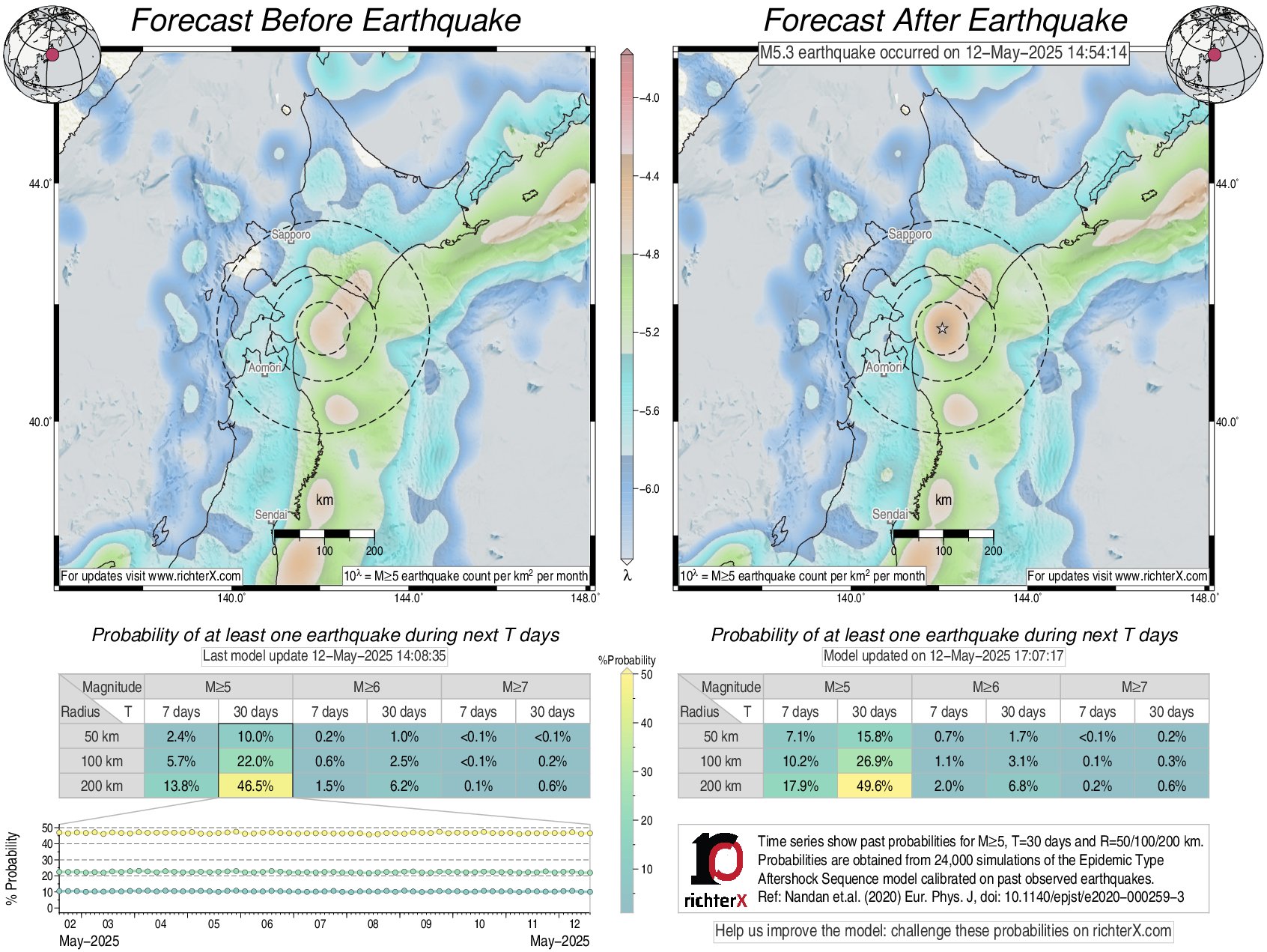 Description: Above is our model's last forecast before the earthquake (left side) and the first forecast after the earthquake (right side). The probabilities are obtained by counting the fraction of simulations that had at least one earthquake above different magnitudes (M5, M6 or M7) within different areas (50, 100 or 200 km) in the next 7 or 30 days. The last 10 day time history of the probabilities (for M5+ during the next 30 days) is shown on the lower left side.