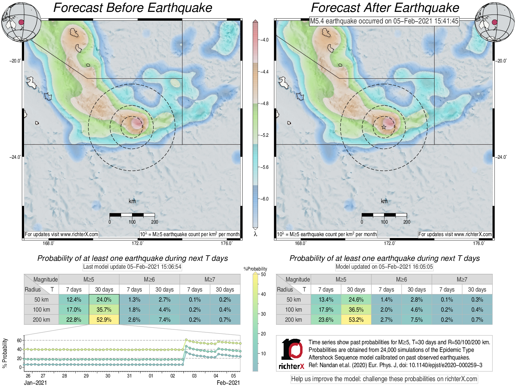 Description: Above is our model's last forecast before the earthquake (left side) and the first forecast after the earthquake (right side). The probabilities are obtained by counting the fraction of simulations that had at least one earthquake above different magnitudes (M5, M6 or M7) within different areas (50, 100 or 200 km) in the next 7 or 30 days. The last 10 day time history of the probabilities (for M5+ during the next 30 days) is shown on the lower left side.