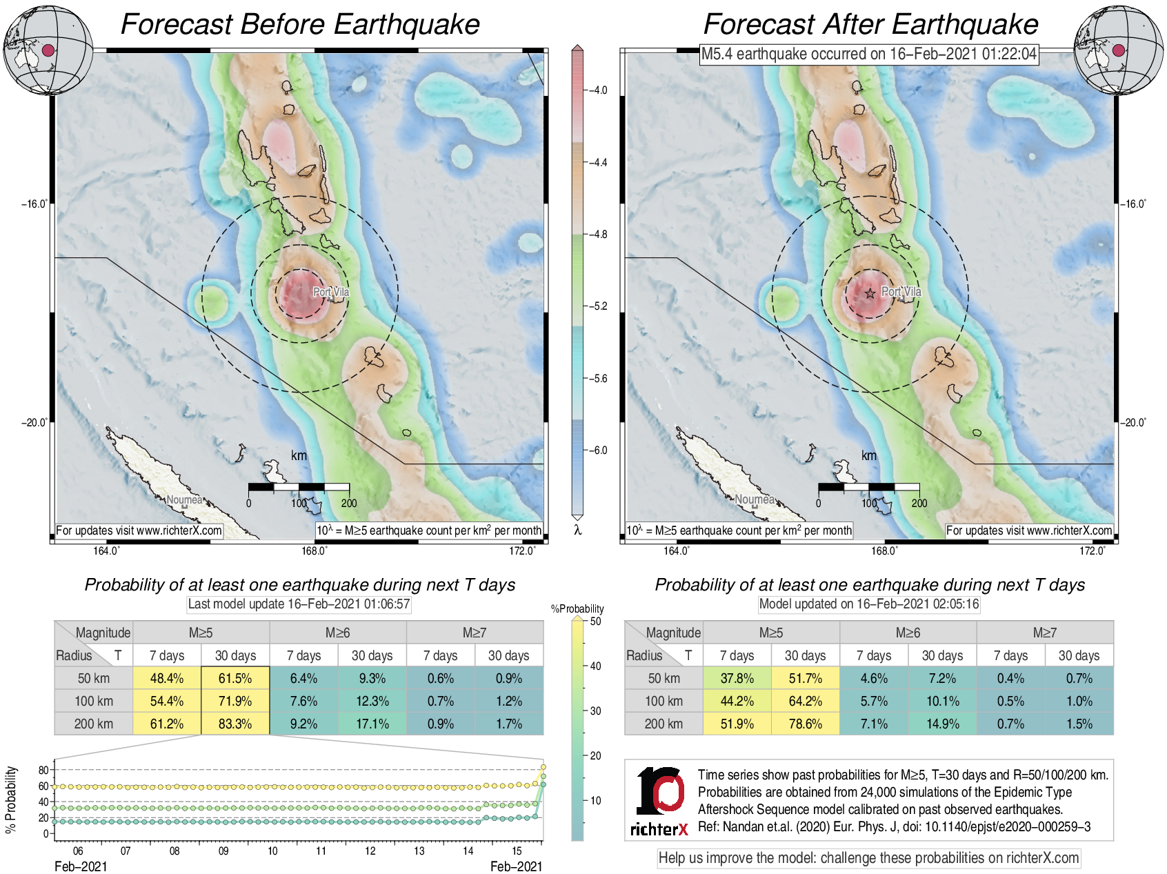 Description: Above is our model's last forecast before the earthquake (left side) and the first forecast after the earthquake (right side). The probabilities are obtained by counting the fraction of simulations that had at least one earthquake above different magnitudes (M5, M6 or M7) within different areas (50, 100 or 200 km) in the next 7 or 30 days. The last 10 day time history of the probabilities (for M5+ during the next 30 days) is shown on the lower left side.