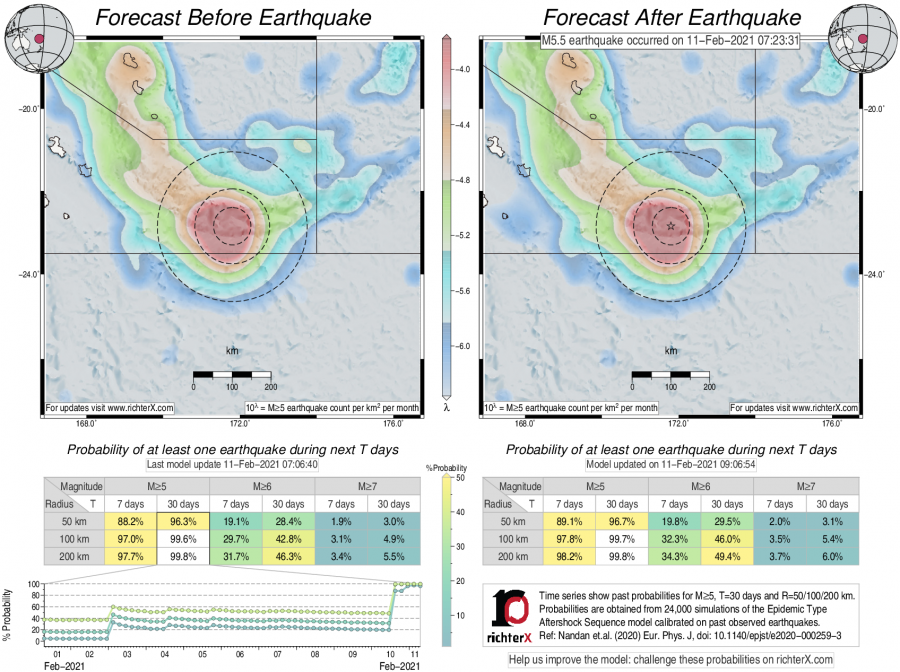 Description: Above is our model's last forecast before the earthquake (left side) and the first forecast after the earthquake (right side). The probabilities are obtained by counting the fraction of simulations that had at least one earthquake above different magnitudes (M5, M6 or M7) within different areas (50, 100 or 200 km) in the next 7 or 30 days. The last 10 day time history of the probabilities (for M5+ during the next 30 days) is shown on the lower left side.