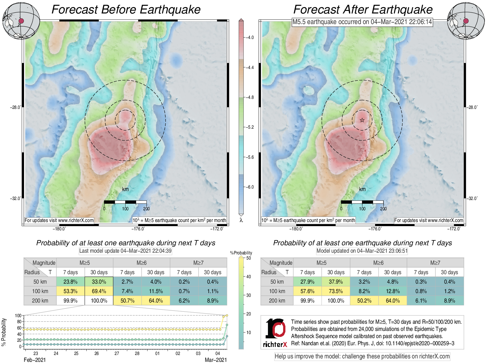 Description: Above is our model's last forecast before the earthquake (left side) and the first forecast after the earthquake (right side). The probabilities are obtained by counting the fraction of simulations that had at least one earthquake above different magnitudes (M5, M6 or M7) within different areas (50, 100 or 200 km) in the next 7 or 30 days. The last 10 day time history of the probabilities (for M5+ during the next 30 days) is shown on the lower left side.