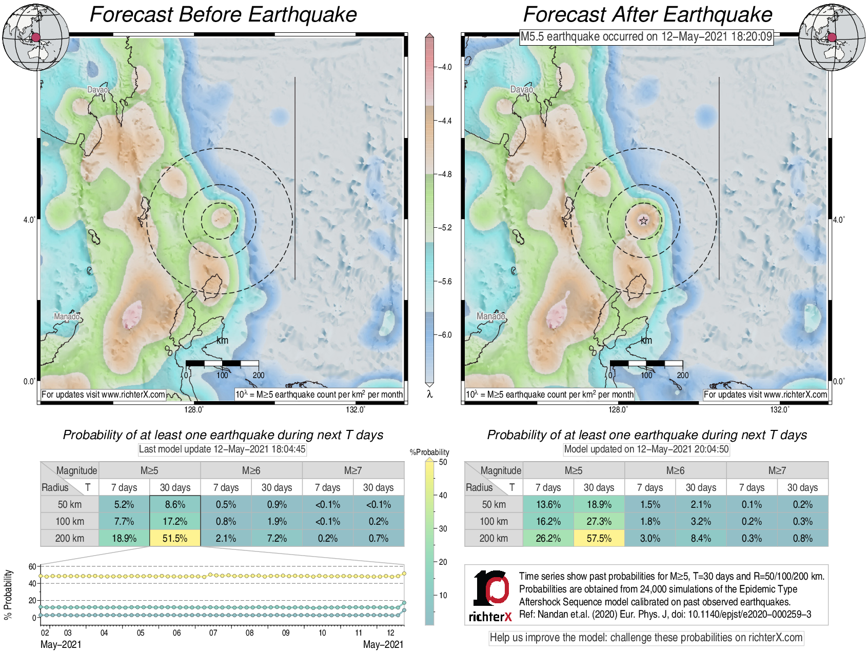 Description: Above is our model's last forecast before the earthquake (left side) and the first forecast after the earthquake (right side). The probabilities are obtained by counting the fraction of simulations that had at least one earthquake above different magnitudes (M5, M6 or M7) within different areas (50, 100 or 200 km) in the next 7 or 30 days. The last 10 day time history of the probabilities (for M5+ during the next 30 days) is shown on the lower left side.