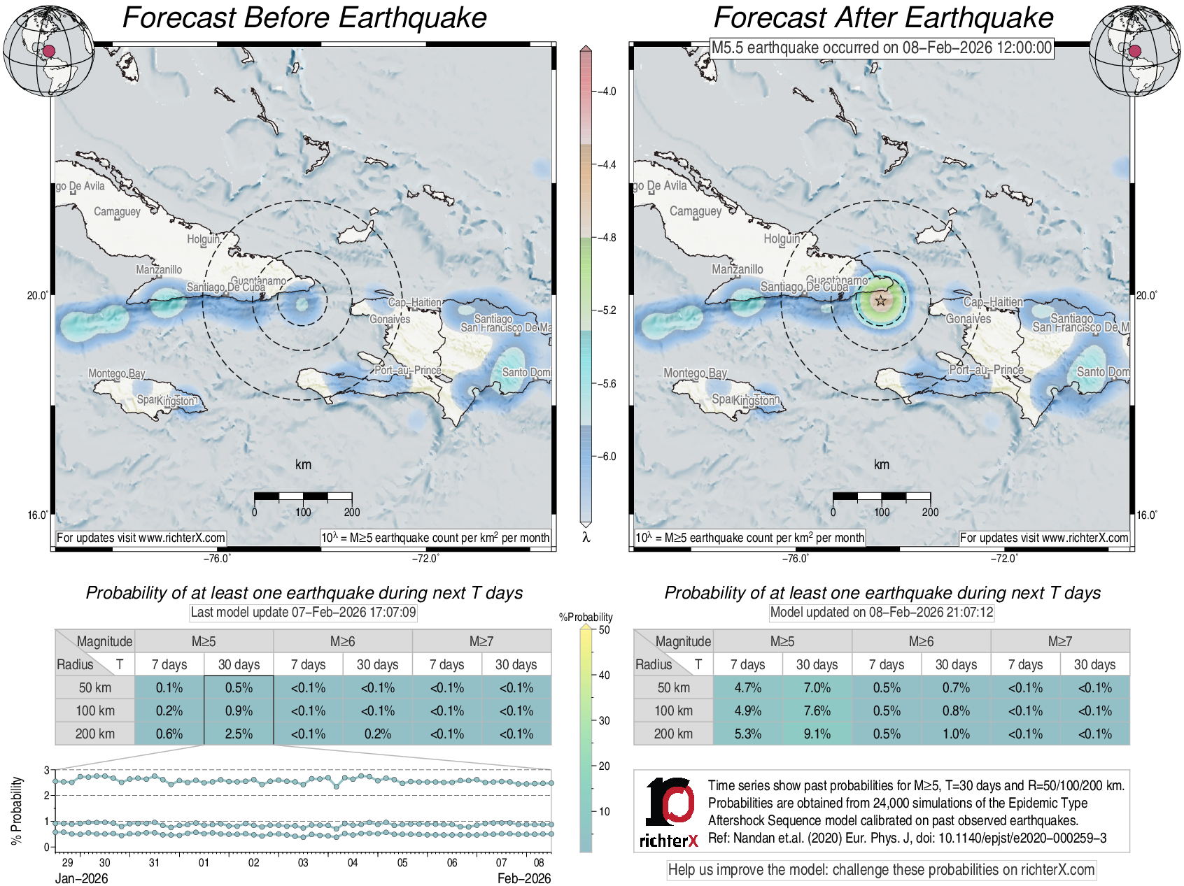 Description: Above is our model's last forecast before the earthquake (left side) and the first forecast after the earthquake (right side). The probabilities are obtained by counting the fraction of simulations that had at least one earthquake above different magnitudes (M5, M6 or M7) within different areas (50, 100 or 200 km) in the next 7 or 30 days. The last 10 day time history of the probabilities (for M5+ during the next 30 days) is shown on the lower left side.
