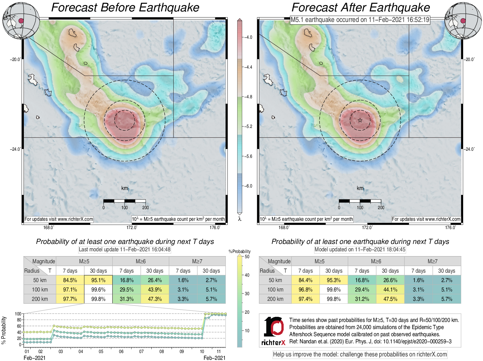 Description: Above is our model's last forecast before the earthquake (left side) and the first forecast after the earthquake (right side). The probabilities are obtained by counting the fraction of simulations that had at least one earthquake above different magnitudes (M5, M6 or M7) within different areas (50, 100 or 200 km) in the next 7 or 30 days. The last 10 day time history of the probabilities (for M5+ during the next 30 days) is shown on the lower left side.