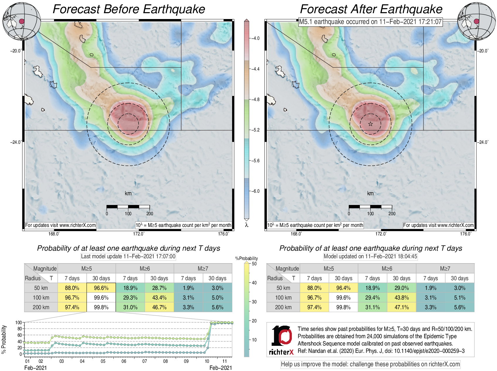 Description: Above is our model's last forecast before the earthquake (left side) and the first forecast after the earthquake (right side). The probabilities are obtained by counting the fraction of simulations that had at least one earthquake above different magnitudes (M5, M6 or M7) within different areas (50, 100 or 200 km) in the next 7 or 30 days. The last 10 day time history of the probabilities (for M5+ during the next 30 days) is shown on the lower left side.