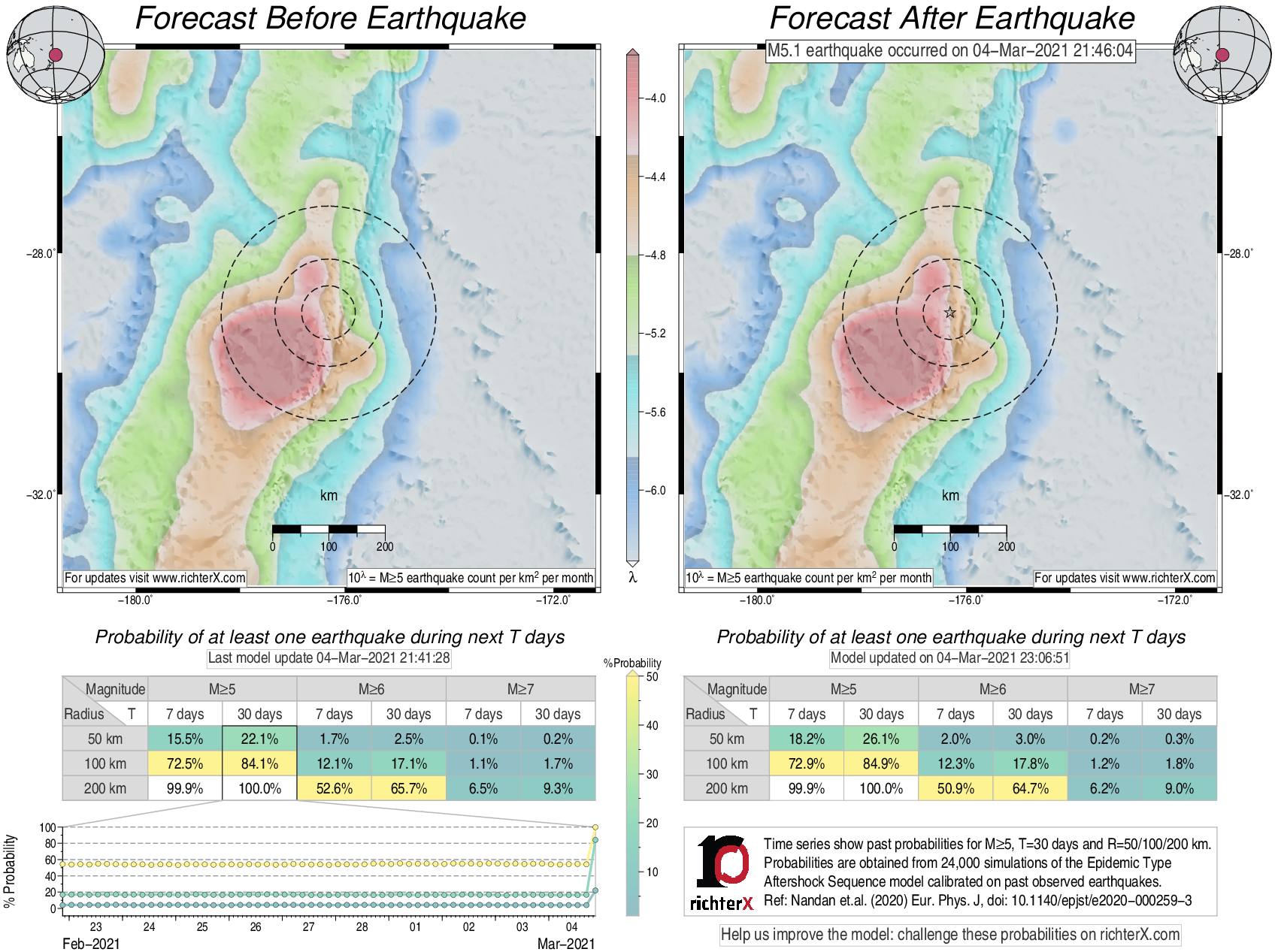Description: Above is our model's last forecast before the earthquake (left side) and the first forecast after the earthquake (right side). The probabilities are obtained by counting the fraction of simulations that had at least one earthquake above different magnitudes (M5, M6 or M7) within different areas (50, 100 or 200 km) in the next 7 or 30 days. The last 10 day time history of the probabilities (for M5+ during the next 30 days) is shown on the lower left side.