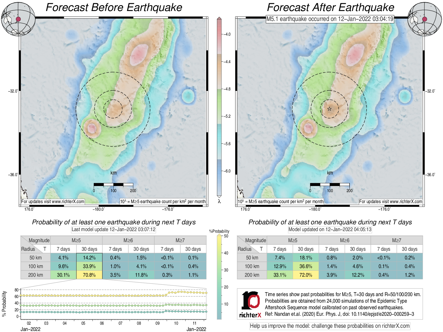 Description: Above is our model's last forecast before the earthquake (left side) and the first forecast after the earthquake (right side). The probabilities are obtained by counting the fraction of simulations that had at least one earthquake above different magnitudes (M5, M6 or M7) within different areas (50, 100 or 200 km) in the next 7 or 30 days. The last 10 day time history of the probabilities (for M5+ during the next 30 days) is shown on the lower left side.