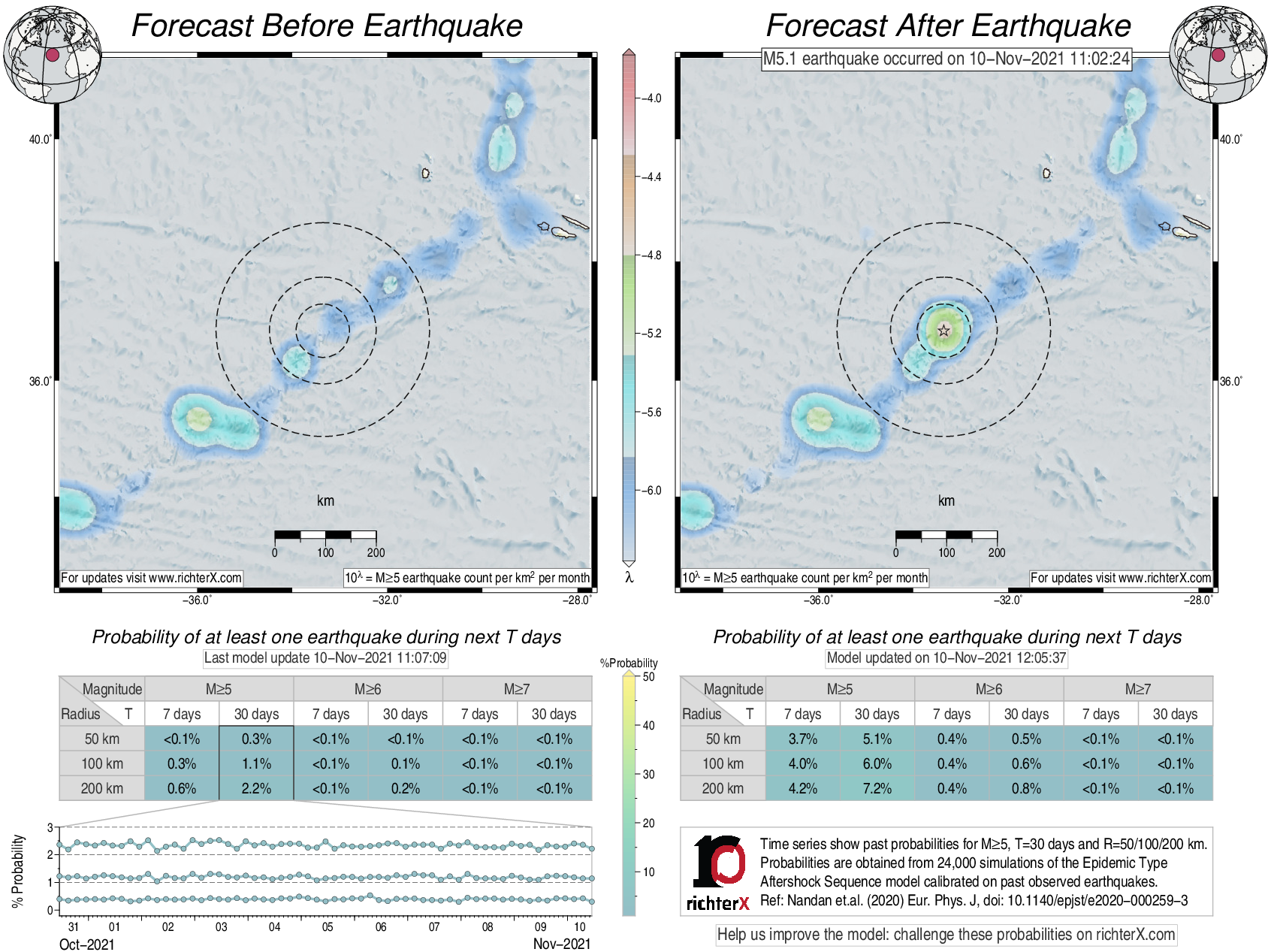 Description: Above is our model's last forecast before the earthquake (left side) and the first forecast after the earthquake (right side). The probabilities are obtained by counting the fraction of simulations that had at least one earthquake above different magnitudes (M5, M6 or M7) within different areas (50, 100 or 200 km) in the next 7 or 30 days. The last 10 day time history of the probabilities (for M5+ during the next 30 days) is shown on the lower left side.