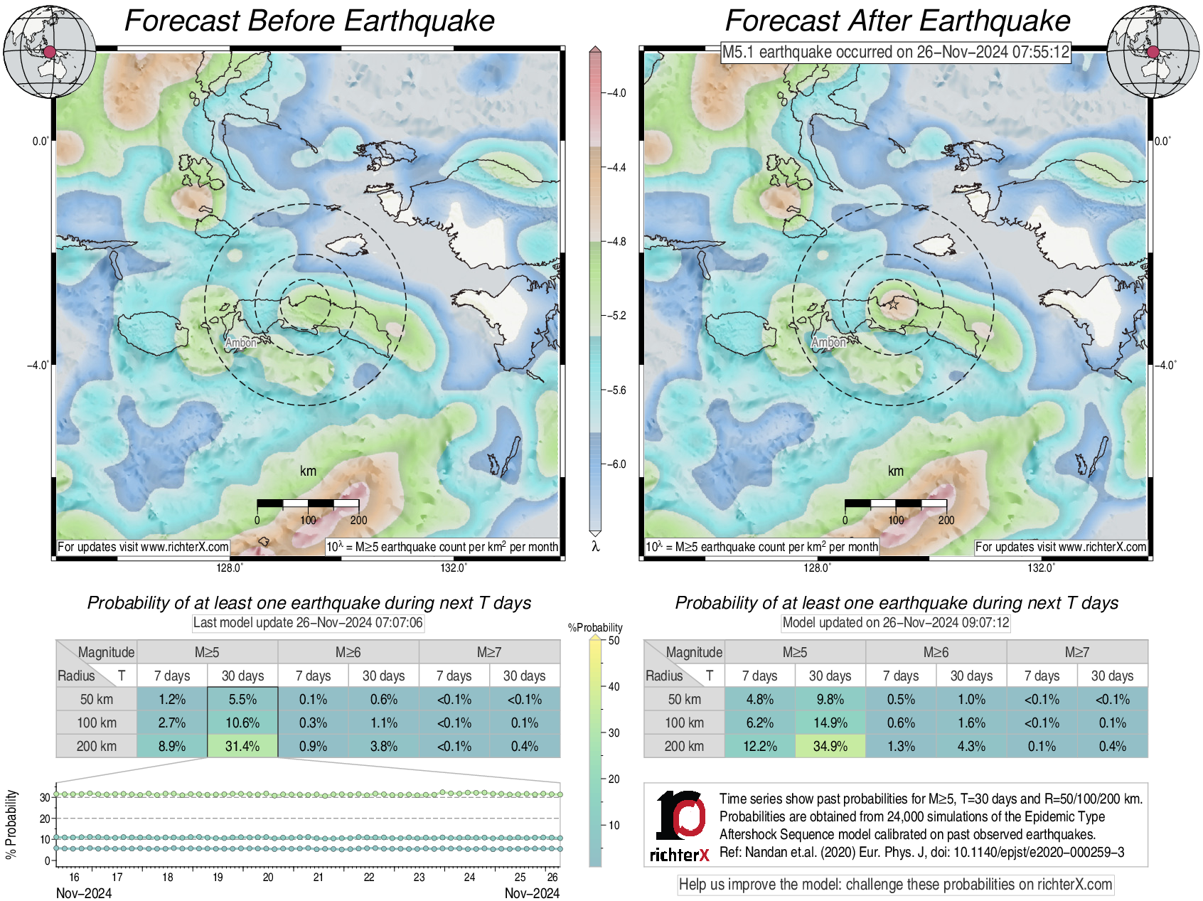 Description: Above is our model's last forecast before the earthquake (left side) and the first forecast after the earthquake (right side). The probabilities are obtained by counting the fraction of simulations that had at least one earthquake above different magnitudes (M5, M6 or M7) within different areas (50, 100 or 200 km) in the next 7 or 30 days. The last 10 day time history of the probabilities (for M5+ during the next 30 days) is shown on the lower left side.