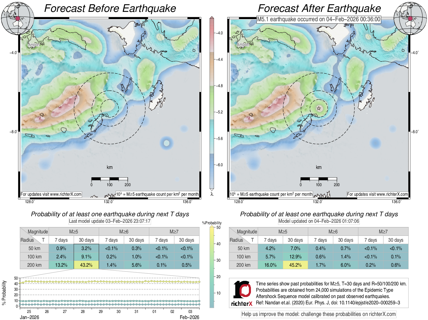 Description: Above is our model's last forecast before the earthquake (left side) and the first forecast after the earthquake (right side). The probabilities are obtained by counting the fraction of simulations that had at least one earthquake above different magnitudes (M5, M6 or M7) within different areas (50, 100 or 200 km) in the next 7 or 30 days. The last 10 day time history of the probabilities (for M5+ during the next 30 days) is shown on the lower left side.