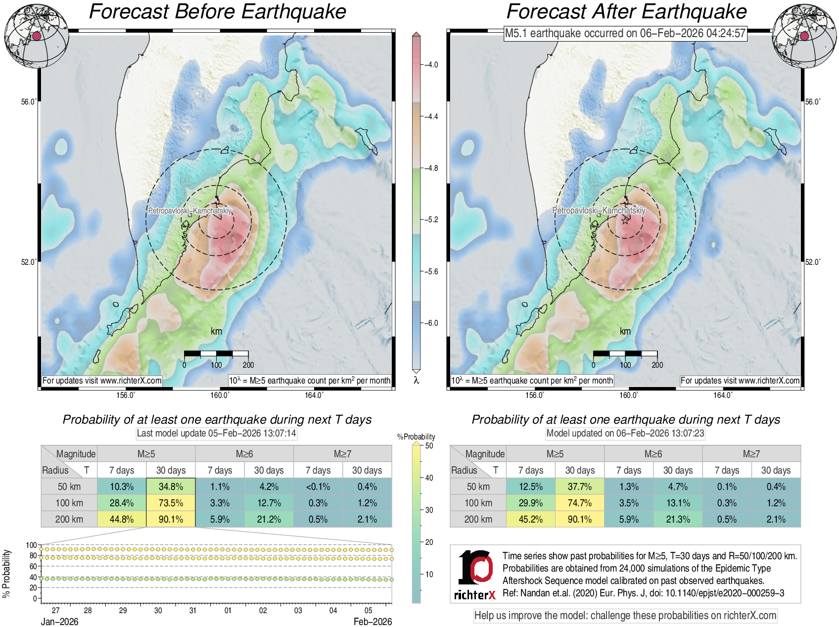 Description: Above is our model's last forecast before the earthquake (left side) and the first forecast after the earthquake (right side). The probabilities are obtained by counting the fraction of simulations that had at least one earthquake above different magnitudes (M5, M6 or M7) within different areas (50, 100 or 200 km) in the next 7 or 30 days. The last 10 day time history of the probabilities (for M5+ during the next 30 days) is shown on the lower left side.