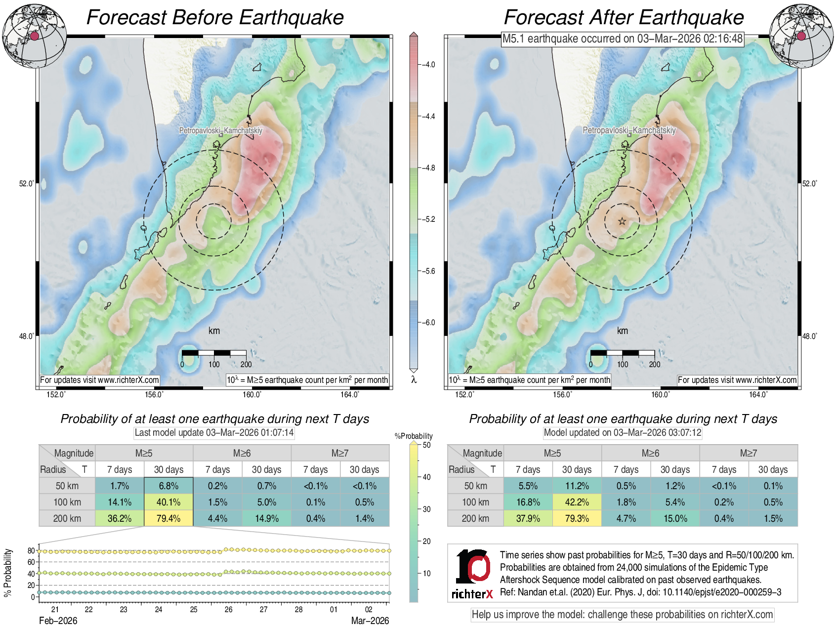 Description: Above is our model's last forecast before the earthquake (left side) and the first forecast after the earthquake (right side). The probabilities are obtained by counting the fraction of simulations that had at least one earthquake above different magnitudes (M5, M6 or M7) within different areas (50, 100 or 200 km) in the next 7 or 30 days. The last 10 day time history of the probabilities (for M5+ during the next 30 days) is shown on the lower left side.
