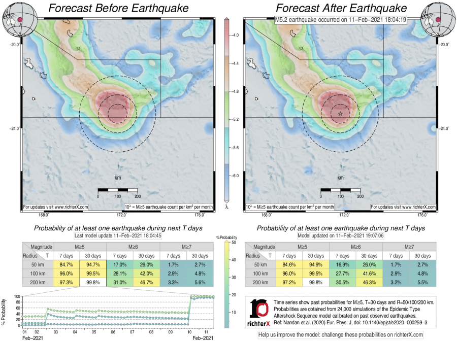 Description: Above is our model's last forecast before the earthquake (left side) and the first forecast after the earthquake (right side). The probabilities are obtained by counting the fraction of simulations that had at least one earthquake above different magnitudes (M5, M6 or M7) within different areas (50, 100 or 200 km) in the next 7 or 30 days. The last 10 day time history of the probabilities (for M5+ during the next 30 days) is shown on the lower left side.
