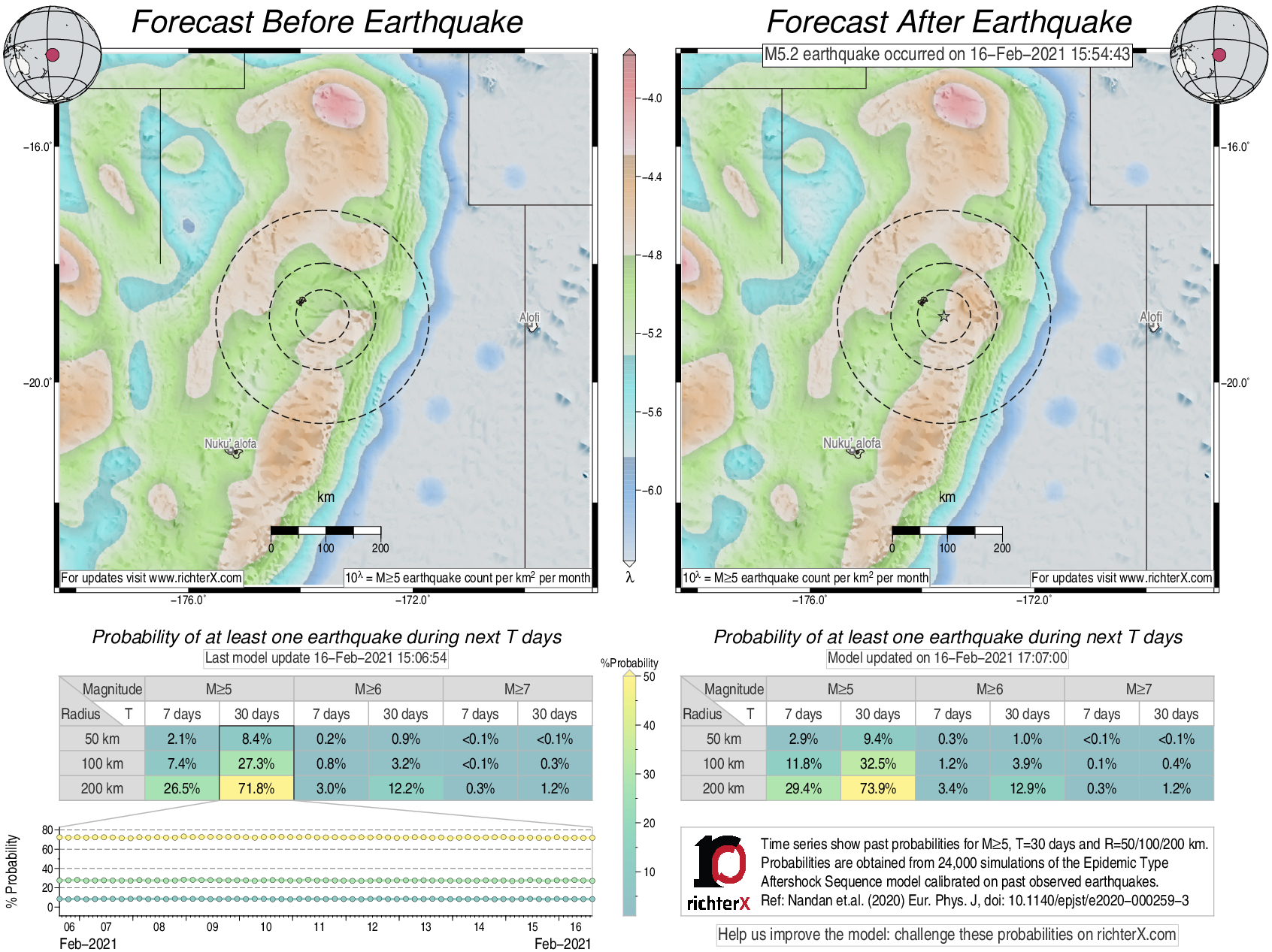 Description: Above is our model's last forecast before the earthquake (left side) and the first forecast after the earthquake (right side). The probabilities are obtained by counting the fraction of simulations that had at least one earthquake above different magnitudes (M5, M6 or M7) within different areas (50, 100 or 200 km) in the next 7 or 30 days. The last 10 day time history of the probabilities (for M5+ during the next 30 days) is shown on the lower left side.