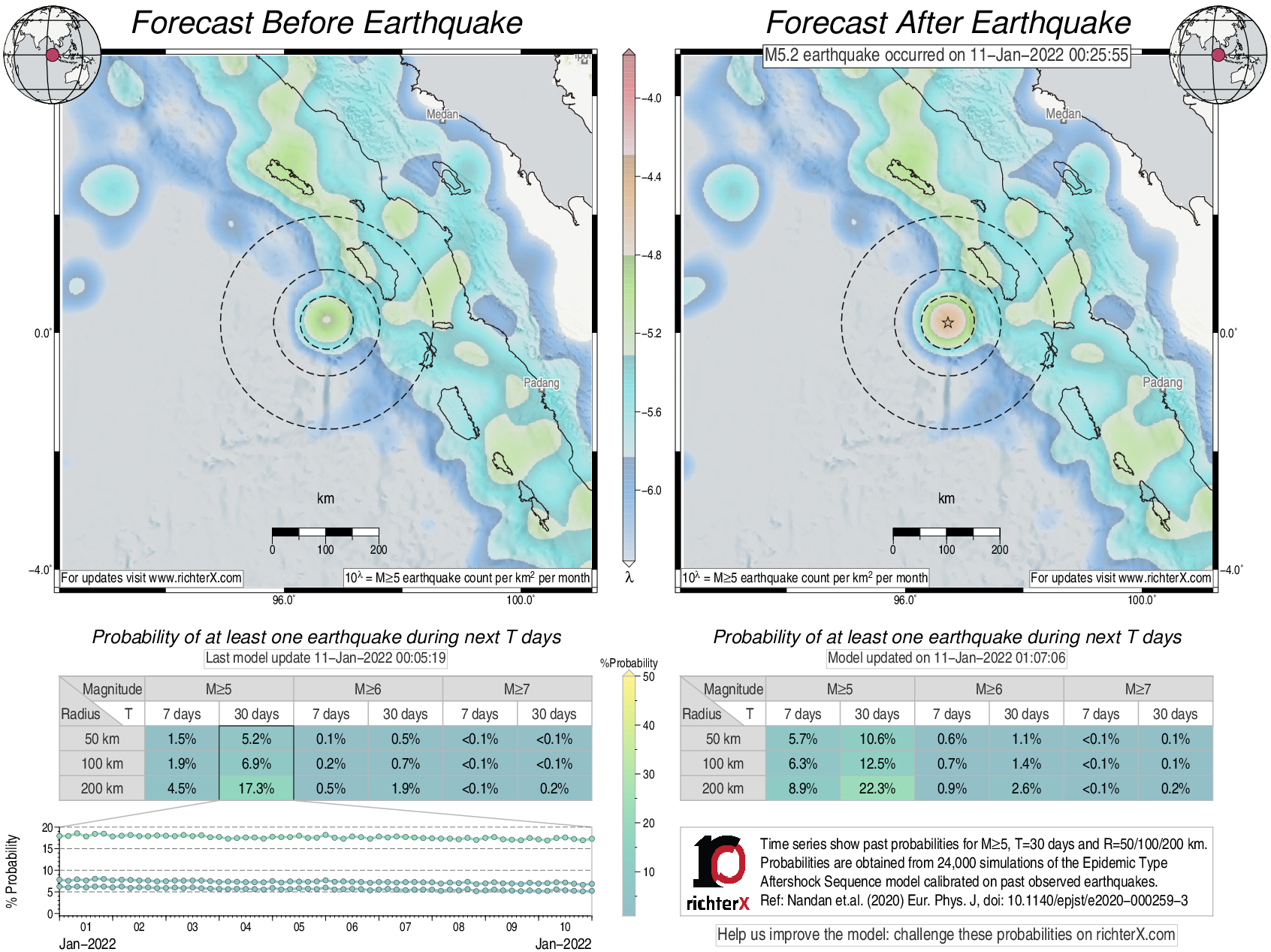 Description: Above is our model's last forecast before the earthquake (left side) and the first forecast after the earthquake (right side). The probabilities are obtained by counting the fraction of simulations that had at least one earthquake above different magnitudes (M5, M6 or M7) within different areas (50, 100 or 200 km) in the next 7 or 30 days. The last 10 day time history of the probabilities (for M5+ during the next 30 days) is shown on the lower left side.