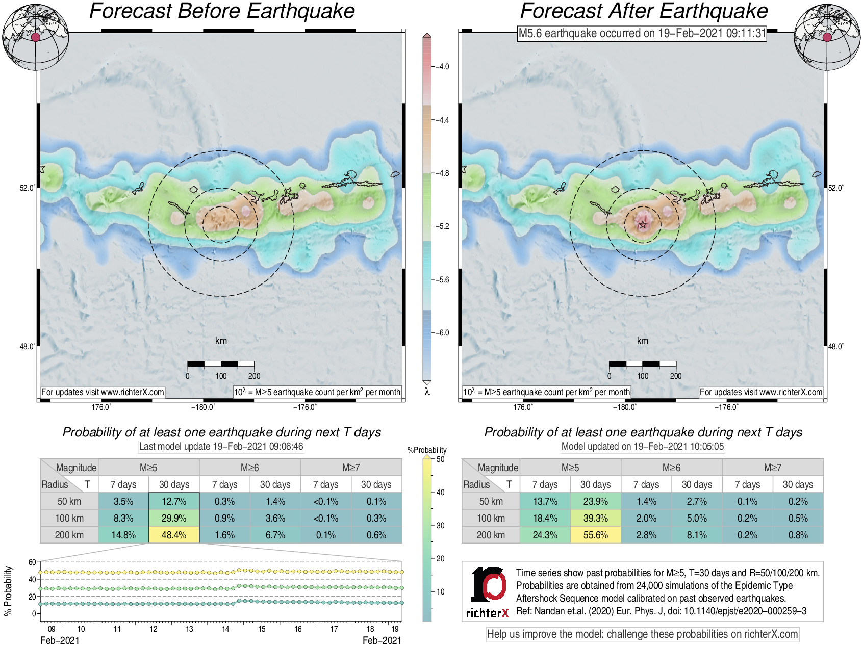 Description: Above is our model's last forecast before the earthquake (left side) and the first forecast after the earthquake (right side). The probabilities are obtained by counting the fraction of simulations that had at least one earthquake above different magnitudes (M5, M6 or M7) within different areas (50, 100 or 200 km) in the next 7 or 30 days. The last 10 day time history of the probabilities (for M5+ during the next 30 days) is shown on the lower left side.