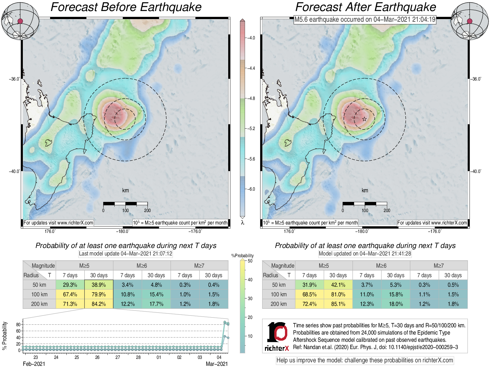 Description: Above is our model's last forecast before the earthquake (left side) and the first forecast after the earthquake (right side). The probabilities are obtained by counting the fraction of simulations that had at least one earthquake above different magnitudes (M5, M6 or M7) within different areas (50, 100 or 200 km) in the next 7 or 30 days. The last 10 day time history of the probabilities (for M5+ during the next 30 days) is shown on the lower left side.
