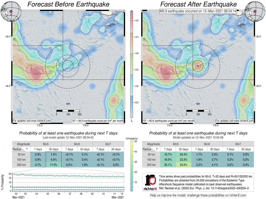 Description: Above is our model's last forecast before the earthquake (left side) and the first forecast after the earthquake (right side). The probabilities are obtained by counting the fraction of simulations that had at least one earthquake above different magnitudes (M5, M6 or M7) within different areas (50, 100 or 200 km) in the next 7 or 30 days. The last 10 day time history of the probabilities (for M5+ during the next 30 days) is shown on the lower left side.