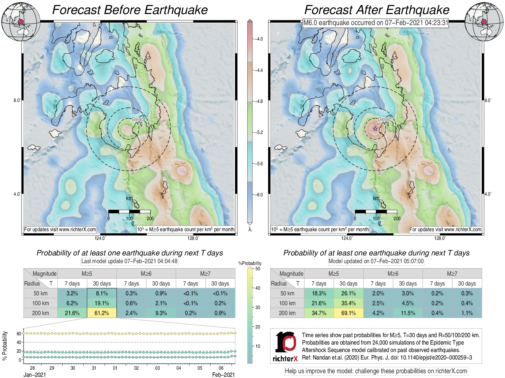 Description: Above is our model's last forecast before the earthquake (left side) and the first forecast after the earthquake (right side). The probabilities are obtained by counting the fraction of simulations that had at least one earthquake above different magnitudes (M5, M6 or M7) within different areas (50, 100 or 200 km) in the next 7 or 30 days. The last 10 day time history of the probabilities (for M5+ during the next 30 days) is shown on the lower left side.