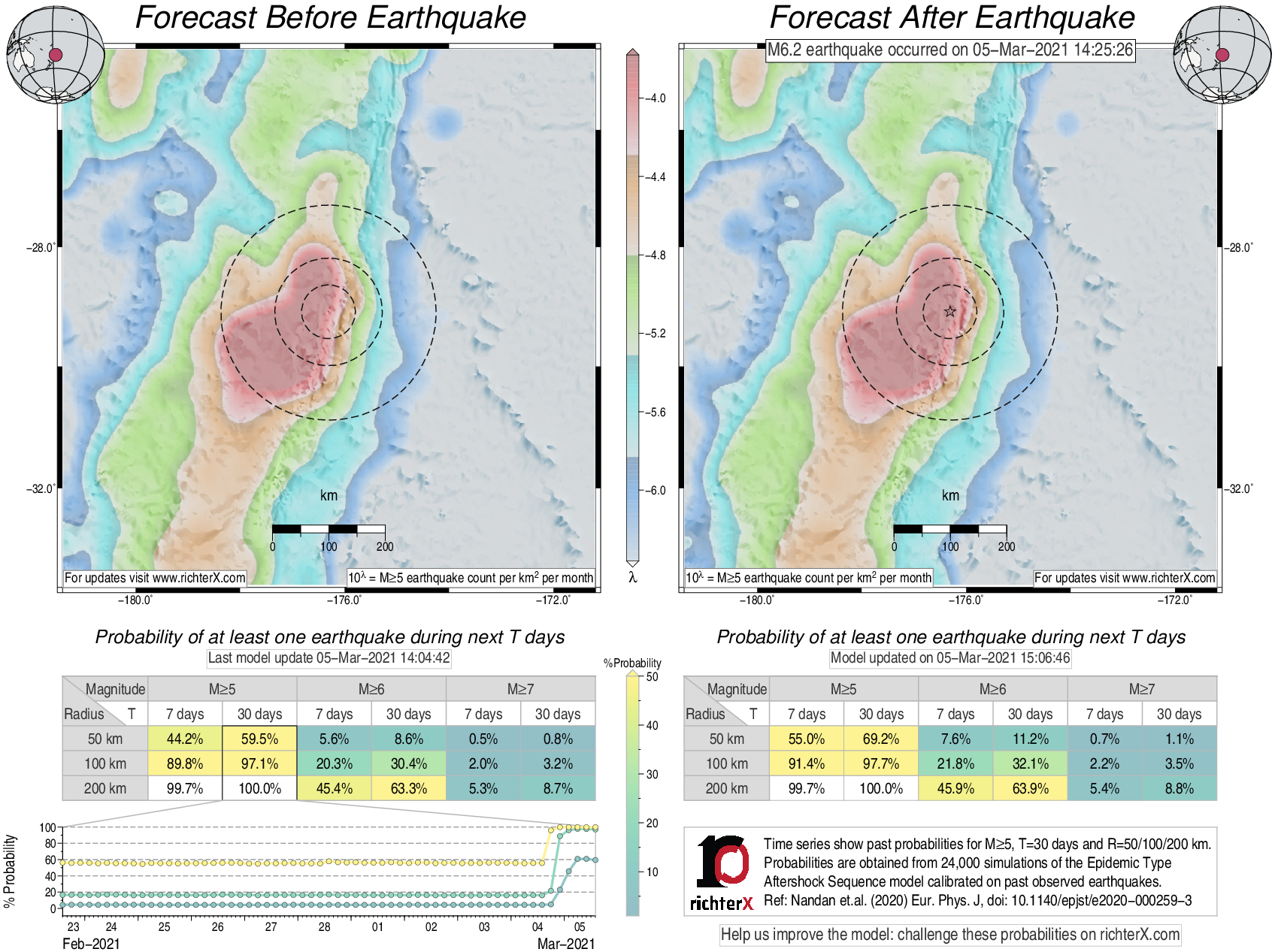 Description: Above is our model's last forecast before the earthquake (left side) and the first forecast after the earthquake (right side). The probabilities are obtained by counting the fraction of simulations that had at least one earthquake above different magnitudes (M5, M6 or M7) within different areas (50, 100 or 200 km) in the next 7 or 30 days. The last 10 day time history of the probabilities (for M5+ during the next 30 days) is shown on the lower left side.