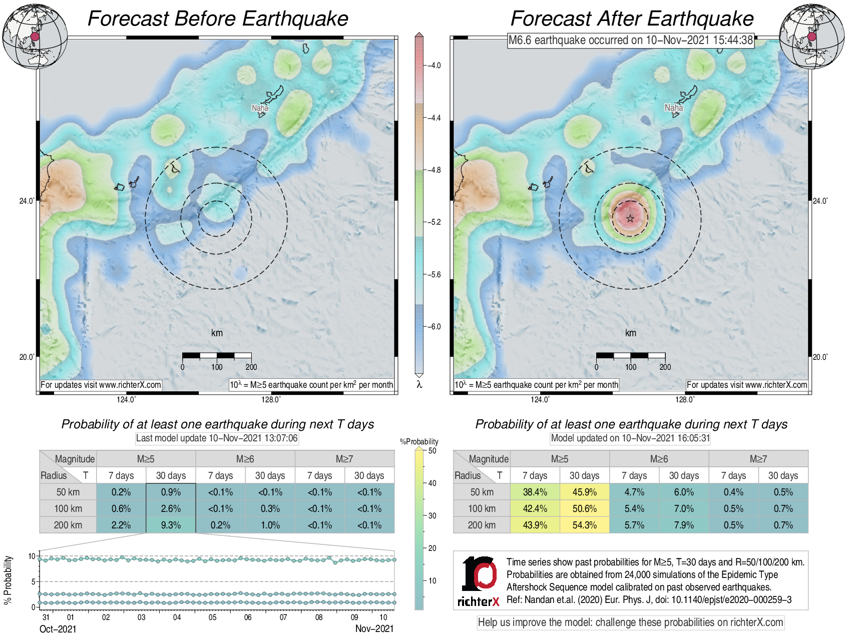 Description: Above is our model's last forecast before the earthquake (left side) and the first forecast after the earthquake (right side). The probabilities are obtained by counting the fraction of simulations that had at least one earthquake above different magnitudes (M5, M6 or M7) within different areas (50, 100 or 200 km) in the next 7 or 30 days. The last 10 day time history of the probabilities (for M5+ during the next 30 days) is shown on the lower left side.