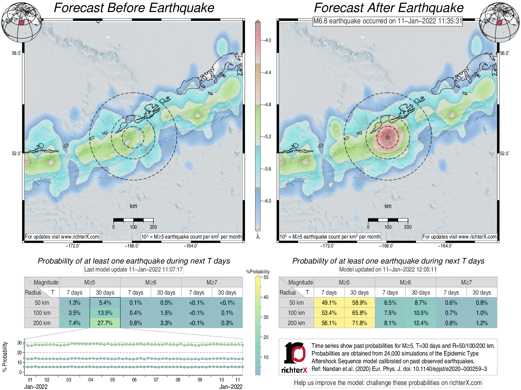 Description: Above is our model's last forecast before the earthquake (left side) and the first forecast after the earthquake (right side). The probabilities are obtained by counting the fraction of simulations that had at least one earthquake above different magnitudes (M5, M6 or M7) within different areas (50, 100 or 200 km) in the next 7 or 30 days. The last 10 day time history of the probabilities (for M5+ during the next 30 days) is shown on the lower left side.