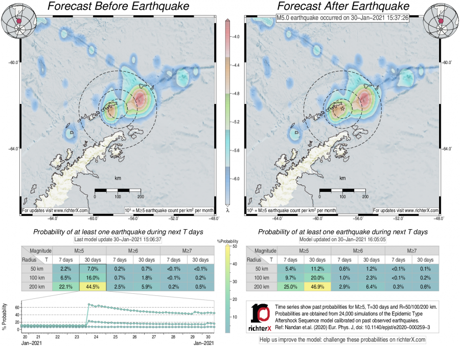 Description: Above is our model's last forecast before the earthquake (left side) and the first forecast after the earthquake (right side). The probabilities are obtained by counting the fraction of simulations that had at least one earthquake above different magnitudes (M5, M6 or M7) within different areas (50, 100 or 200 km) in the next 7 or 30 days. The last 10 day time history of the probabilities (for M5+ during the next 30 days) is shown on the lower left side.