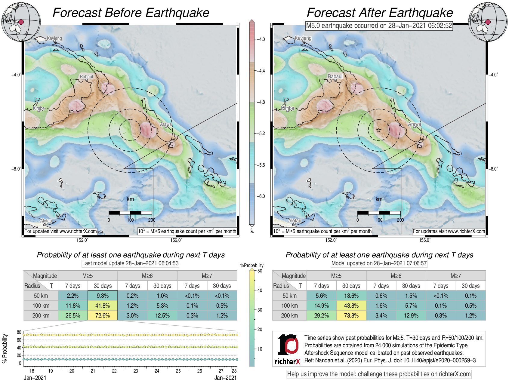 Description: Above is our model's last forecast before the earthquake (left side) and the first forecast after the earthquake (right side). The probabilities are obtained by counting the fraction of simulations that had at least one earthquake above different magnitudes (M5, M6 or M7) within different areas (50, 100 or 200 km) in the next 7 or 30 days. The last 10 day time history of the probabilities (for M5+ during the next 30 days) is shown on the lower left side.