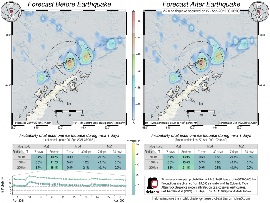 Description: Above is our model's last forecast before the earthquake (left side) and the first forecast after the earthquake (right side). The probabilities are obtained by counting the fraction of simulations that had at least one earthquake above different magnitudes (M5, M6 or M7) within different areas (50, 100 or 200 km) in the next 7 or 30 days. The last 10 day time history of the probabilities (for M5+ during the next 30 days) is shown on the lower left side.