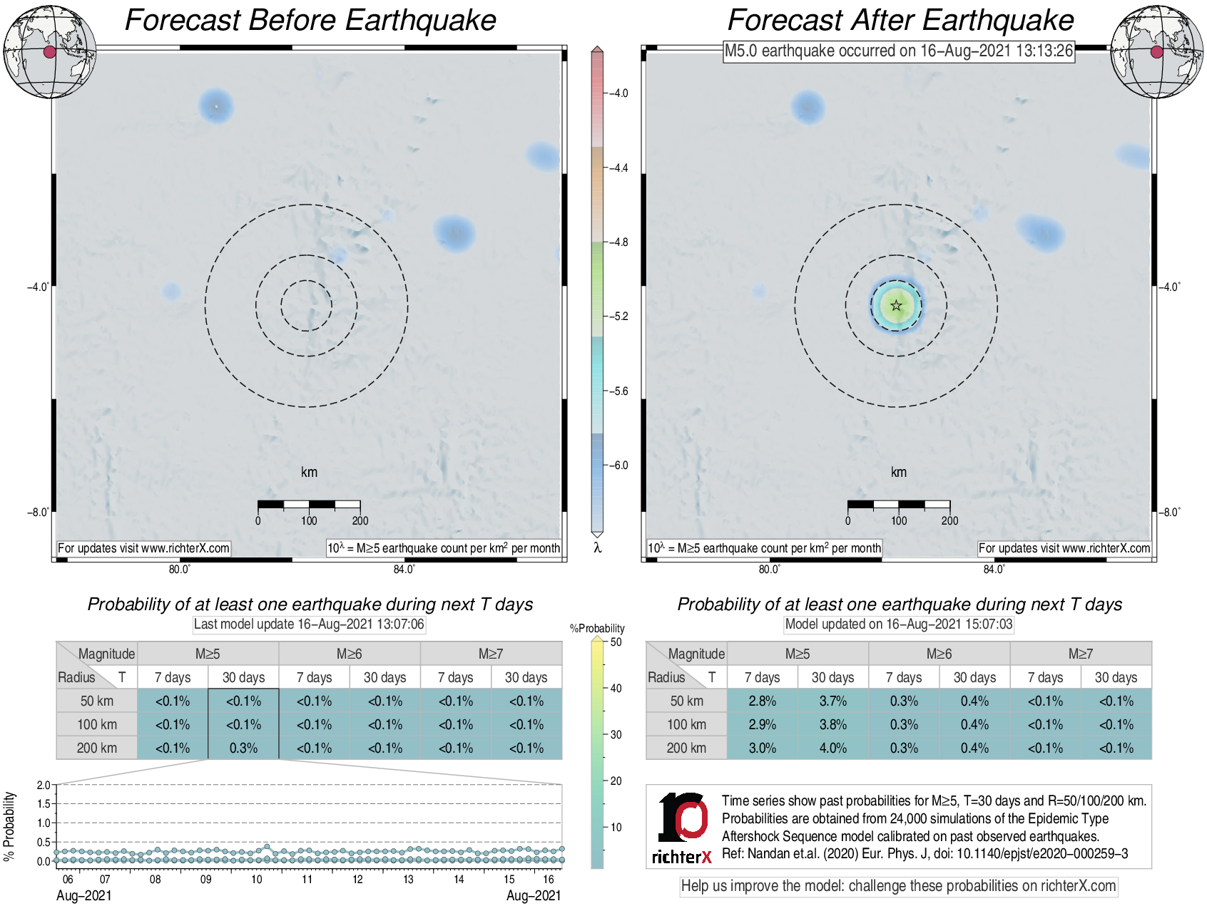 Description: Above is our model's last forecast before the earthquake (left side) and the first forecast after the earthquake (right side). The probabilities are obtained by counting the fraction of simulations that had at least one earthquake above different magnitudes (M5, M6 or M7) within different areas (50, 100 or 200 km) in the next 7 or 30 days. The last 10 day time history of the probabilities (for M5+ during the next 30 days) is shown on the lower left side.