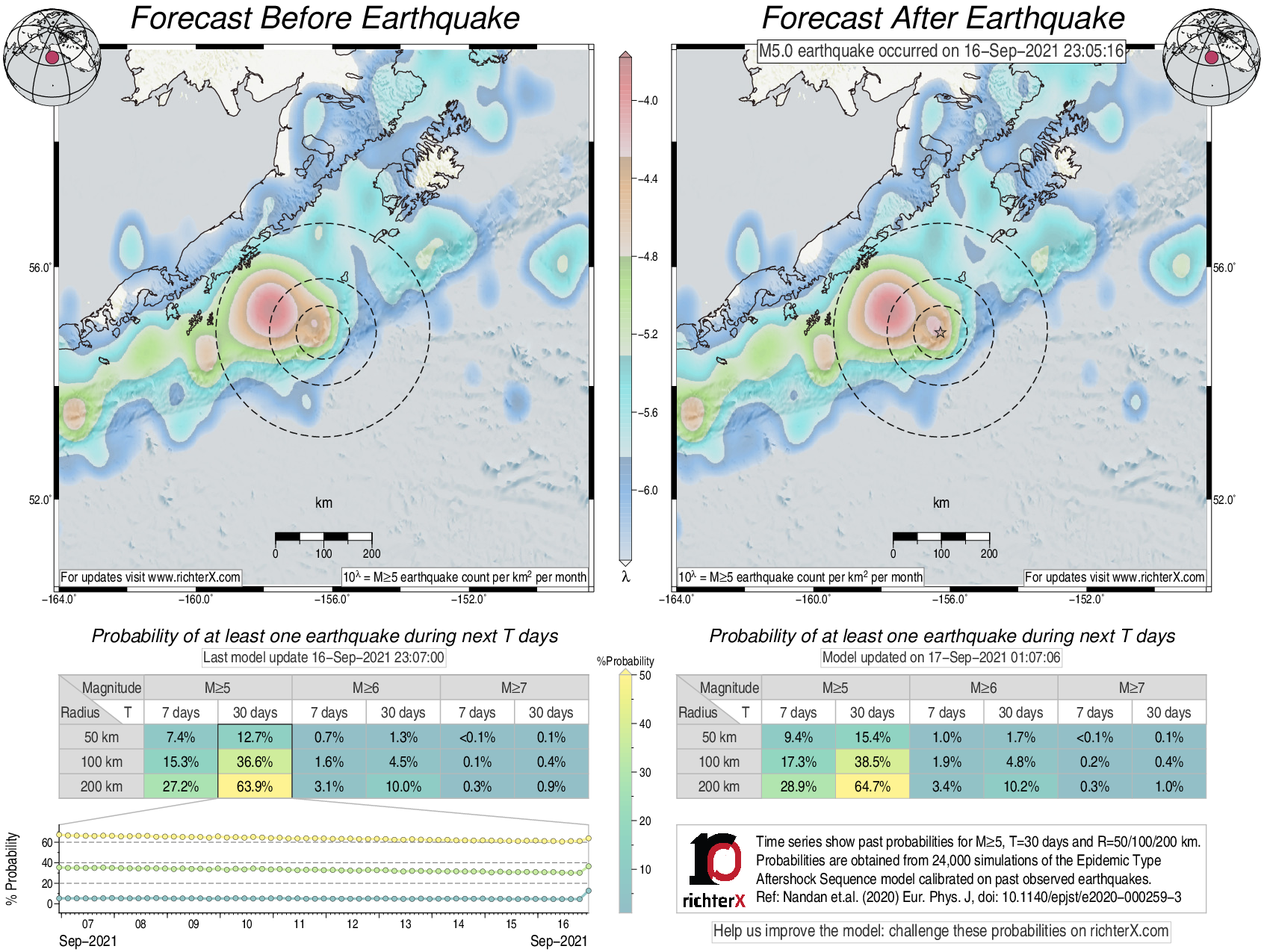 Description: Above is our model's last forecast before the earthquake (left side) and the first forecast after the earthquake (right side). The probabilities are obtained by counting the fraction of simulations that had at least one earthquake above different magnitudes (M5, M6 or M7) within different areas (50, 100 or 200 km) in the next 7 or 30 days. The last 10 day time history of the probabilities (for M5+ during the next 30 days) is shown on the lower left side.