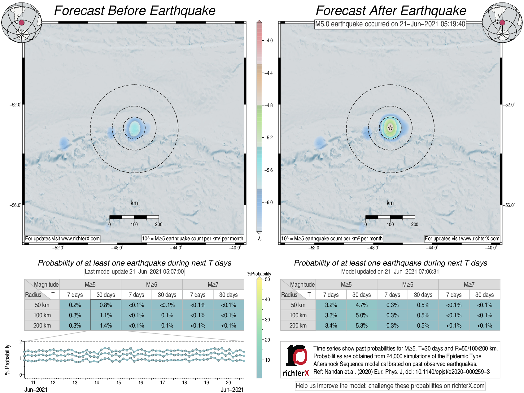 Description: Above is our model's last forecast before the earthquake (left side) and the first forecast after the earthquake (right side). The probabilities are obtained by counting the fraction of simulations that had at least one earthquake above different magnitudes (M5, M6 or M7) within different areas (50, 100 or 200 km) in the next 7 or 30 days. The last 10 day time history of the probabilities (for M5+ during the next 30 days) is shown on the lower left side.