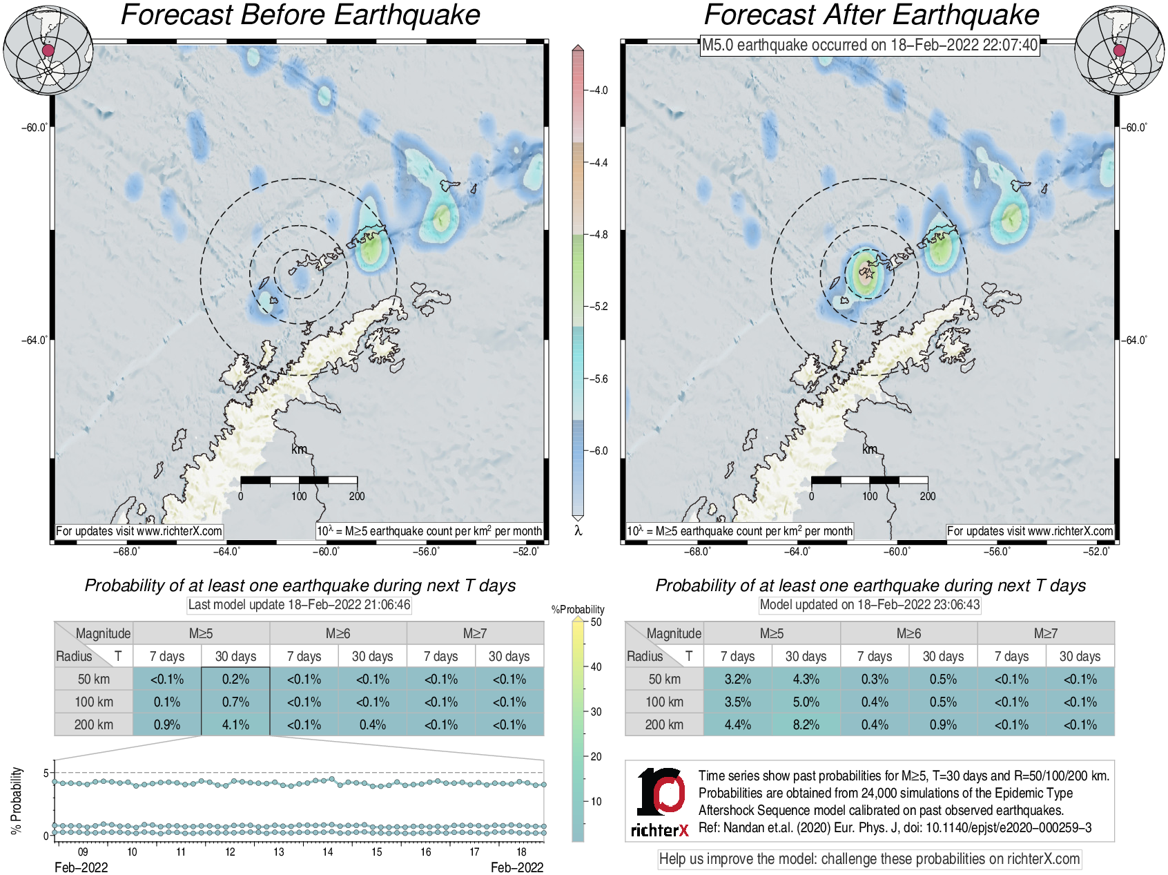 Description: Above is our model's last forecast before the earthquake (left side) and the first forecast after the earthquake (right side). The probabilities are obtained by counting the fraction of simulations that had at least one earthquake above different magnitudes (M5, M6 or M7) within different areas (50, 100 or 200 km) in the next 7 or 30 days. The last 10 day time history of the probabilities (for M5+ during the next 30 days) is shown on the lower left side.