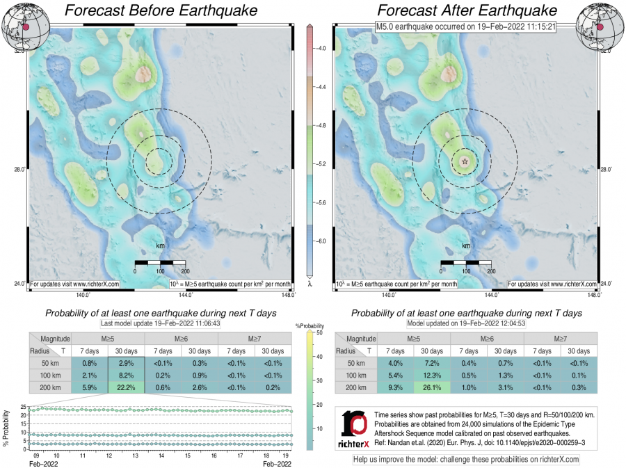 Description: Above is our model's last forecast before the earthquake (left side) and the first forecast after the earthquake (right side). The probabilities are obtained by counting the fraction of simulations that had at least one earthquake above different magnitudes (M5, M6 or M7) within different areas (50, 100 or 200 km) in the next 7 or 30 days. The last 10 day time history of the probabilities (for M5+ during the next 30 days) is shown on the lower left side.