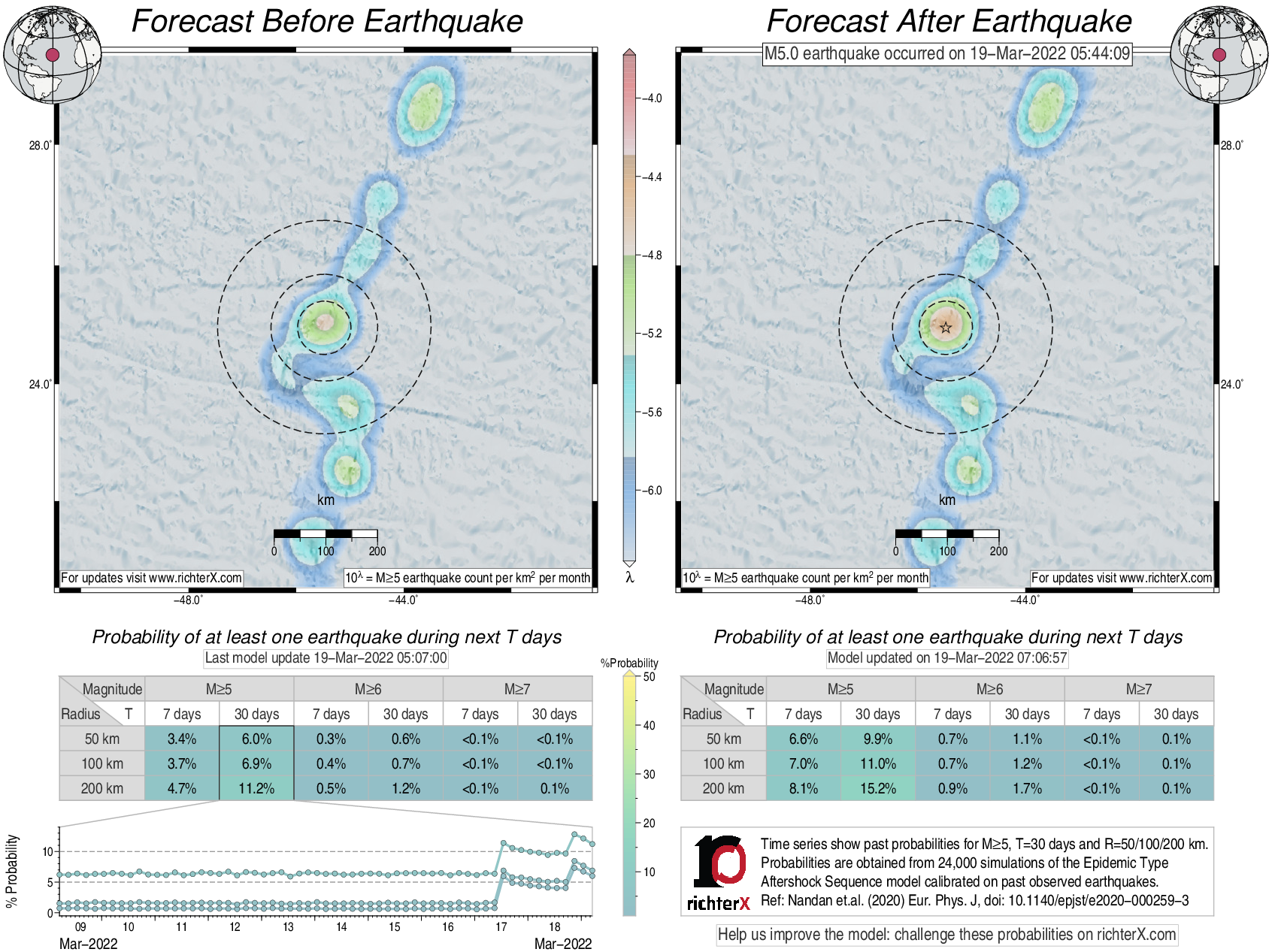 Description: Above is our model's last forecast before the earthquake (left side) and the first forecast after the earthquake (right side). The probabilities are obtained by counting the fraction of simulations that had at least one earthquake above different magnitudes (M5, M6 or M7) within different areas (50, 100 or 200 km) in the next 7 or 30 days. The last 10 day time history of the probabilities (for M5+ during the next 30 days) is shown on the lower left side.
