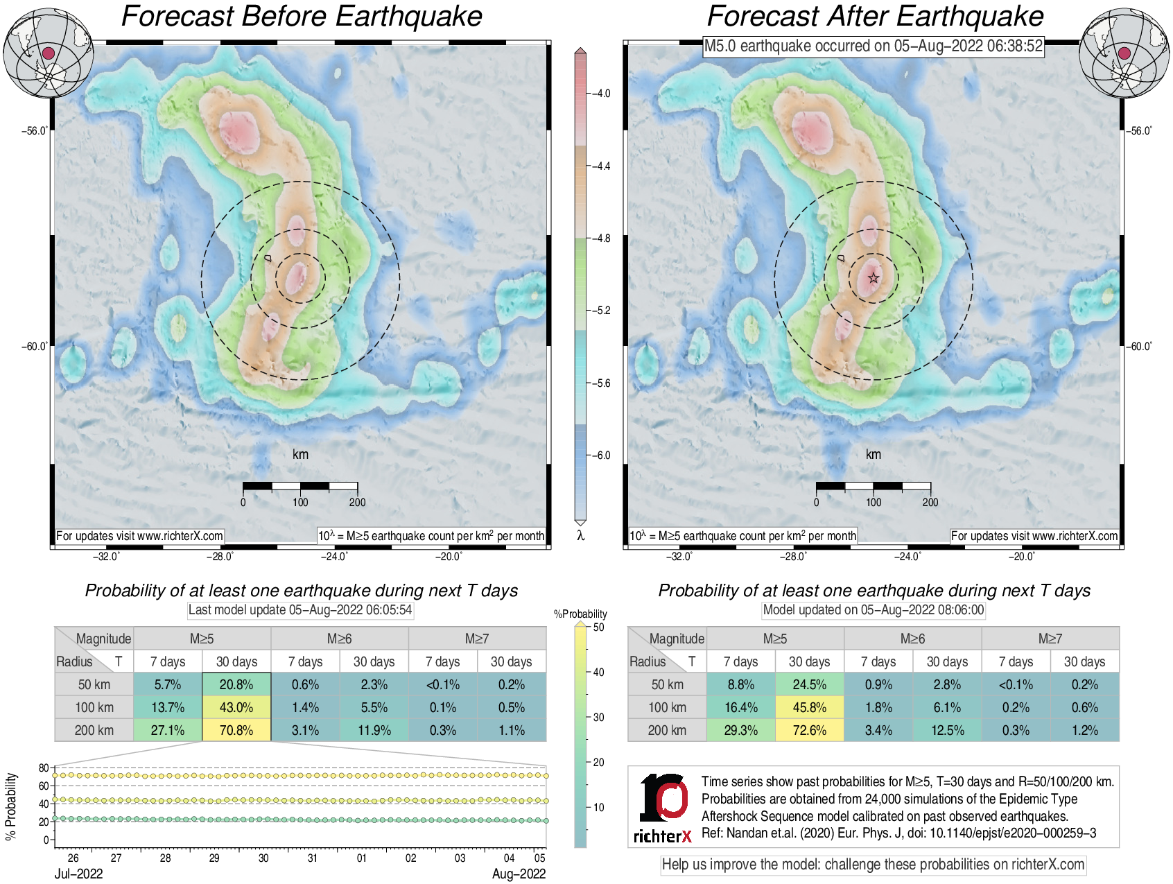 Description: Above is our model's last forecast before the earthquake (left side) and the first forecast after the earthquake (right side). The probabilities are obtained by counting the fraction of simulations that had at least one earthquake above different magnitudes (M5, M6 or M7) within different areas (50, 100 or 200 km) in the next 7 or 30 days. The last 10 day time history of the probabilities (for M5+ during the next 30 days) is shown on the lower left side.