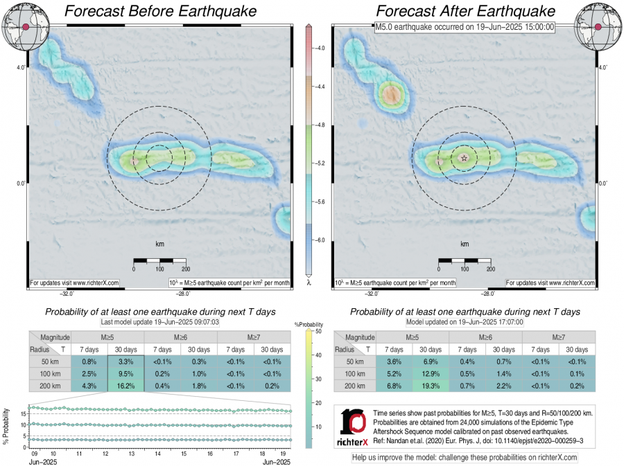 Description: Above is our model's last forecast before the earthquake (left side) and the first forecast after the earthquake (right side). The probabilities are obtained by counting the fraction of simulations that had at least one earthquake above different magnitudes (M5, M6 or M7) within different areas (50, 100 or 200 km) in the next 7 or 30 days. The last 10 day time history of the probabilities (for M5+ during the next 30 days) is shown on the lower left side.